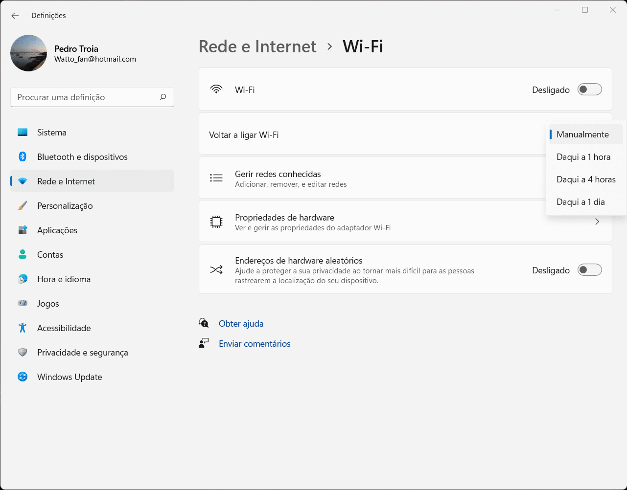 Opcionalmente, pode definir o período em que a rede está desligada. Clique no menu que está à direita de ‘Voltar a ligar Wi-fi’ e defina se quer voltar a ligar a rede manualmente ou que se ligue automaticamente em uma hora, em quatro horas ou em um dia.