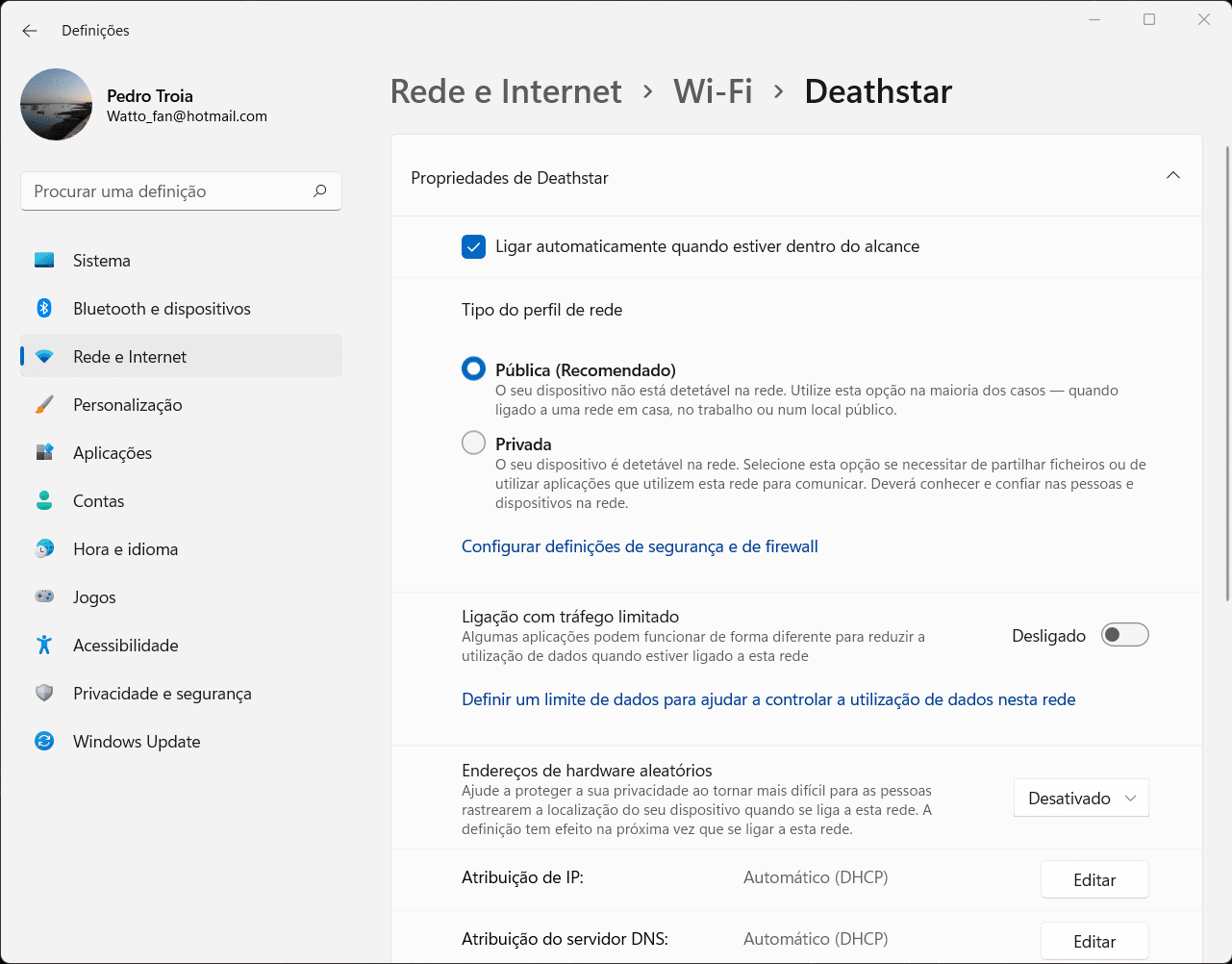 Privada: Os outros dispositivos ligados à rede podem ver o seu computador. Se pretender partilhar ficheiros, impressoras ou usar aplicações de rede na rede local deve ter esta opção ligada.
