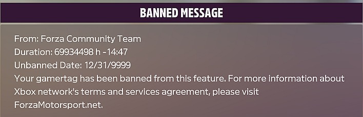 Por esta brincadeira, a Turn 10 baniu este jogador por 8000 anos, como se pode ver pela imagem. A decoração foi removida da biblioteca de decorações do Forza, apesar de quem a descarregou poder continuar a usá-la.