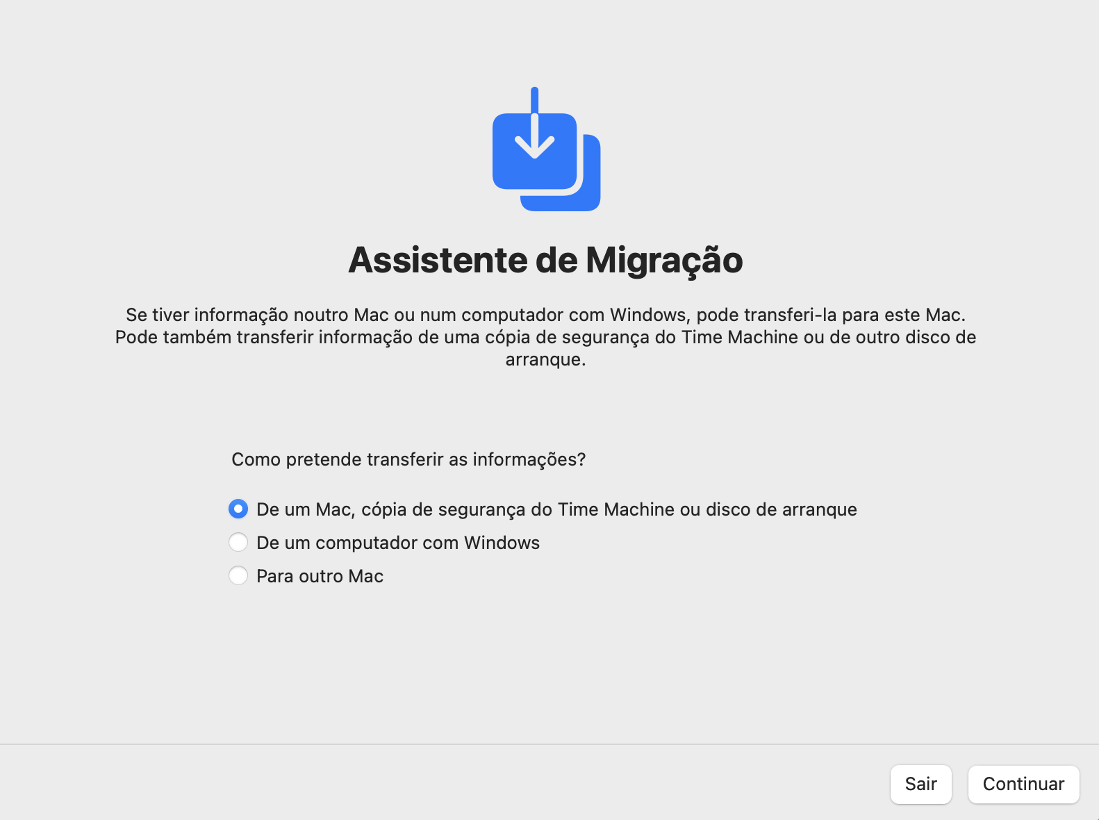 5 – Por momentos, o macOS parece desligar-se e, quando voltar, surge uma janela para iniciar o processo de transição. Na janela que surge no ecrã, aparecem três opções para fazer a migração: ‘De um Mac, cópia de segurança do Time Machine ou disco de arranque’, ‘De um computador com Windows’ e ‘Para outro Mac’. Escolha a primeira.
