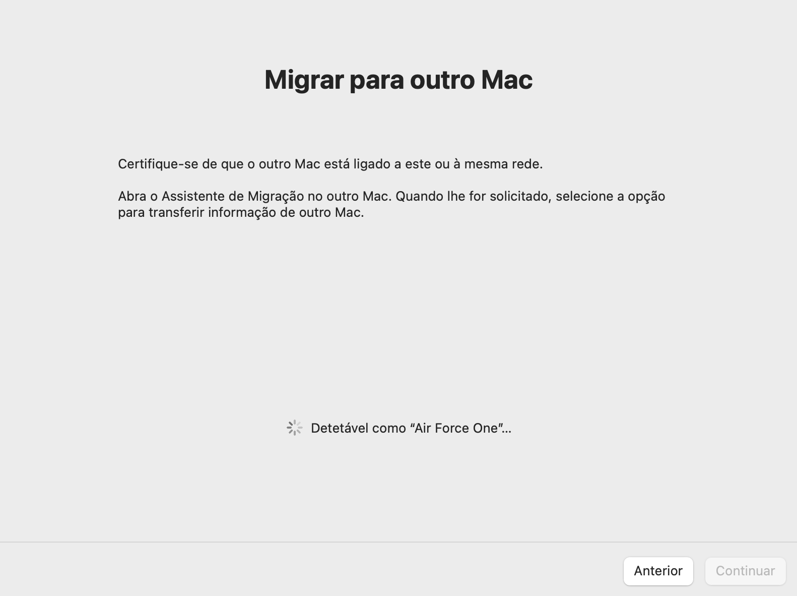 6 – Na nova janela, onde aparece a indicação de que o novo Mac está detectável na rede, o sistema pede-lhe para entrar no Assistente de Migração no outro computador. Faça isto mesmo, para dar continuidade ao processo de transferência de dados – e não se esqueça: tem de estar os dois na mesma rede Wi-Fi e próximos um do outro.