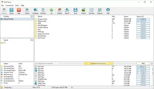 Na mesma zona da interface, pode também ver as pastas que foram pesquisadas e à direita são mostradas várias formas de analisar os dados. O utilizador não pode apagar ficheiros de dentro do programa e esta aplicação é um pouco mais lenta que as demais.