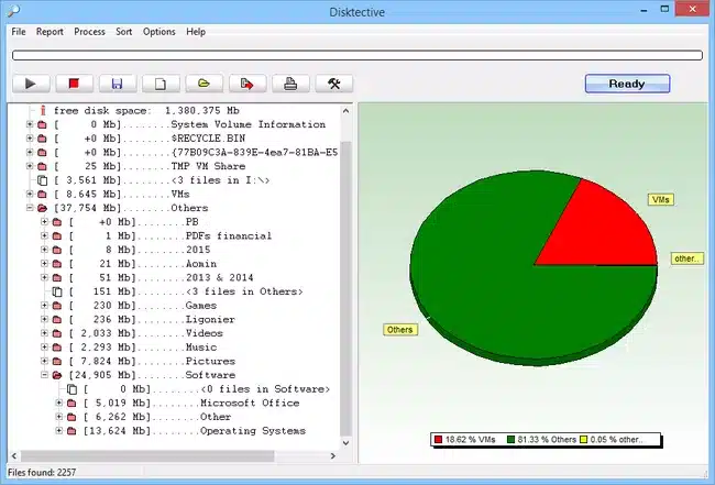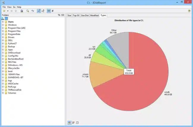 O JDiskReport, mostra os ficheiros que estão numa unidade de armazenamento sob a forma de uma lista, um gráfico de barras ou “queijo”. Esta representação gráfica permite ao utilizador ver de relance o espaço que está ocupado no disco.