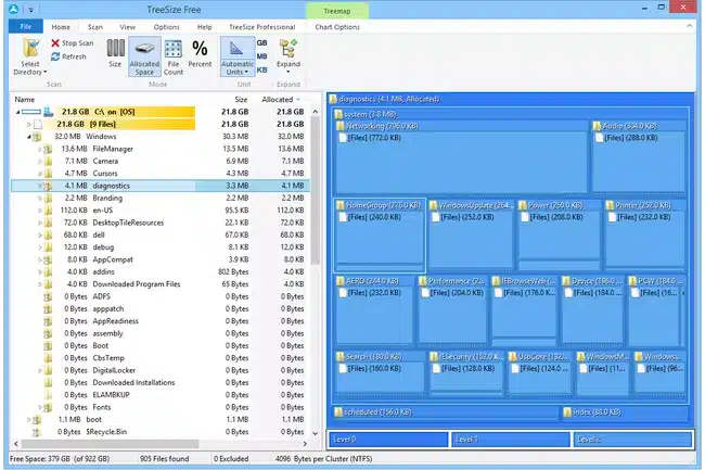 O painel esquerdo do programa mostra o espaço ocupado pelos ficheiros e pastas com uma representação gráfica semelhante à do Explorador de Ficheiros, do lado direito é mostrado um gráfico circular que permite ver o espaço ocupado por cada pasta.