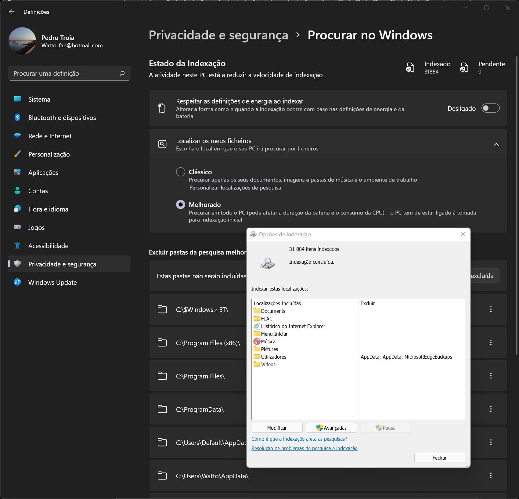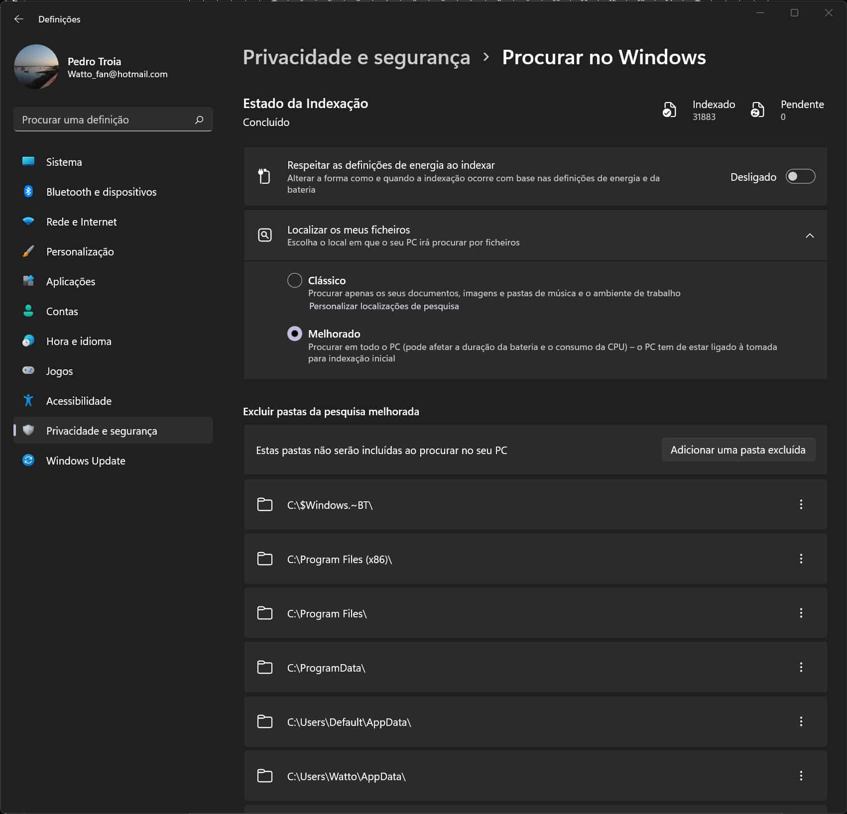 Aceda às ‘Definições’ (Tecla Windows + i) e depois aceda a ‘Privacidade e segurança’, ‘Procurar no Windows’ e veja as pastas mencionadas na lista ‘Excluir pastas da pesquisa melhorada’.