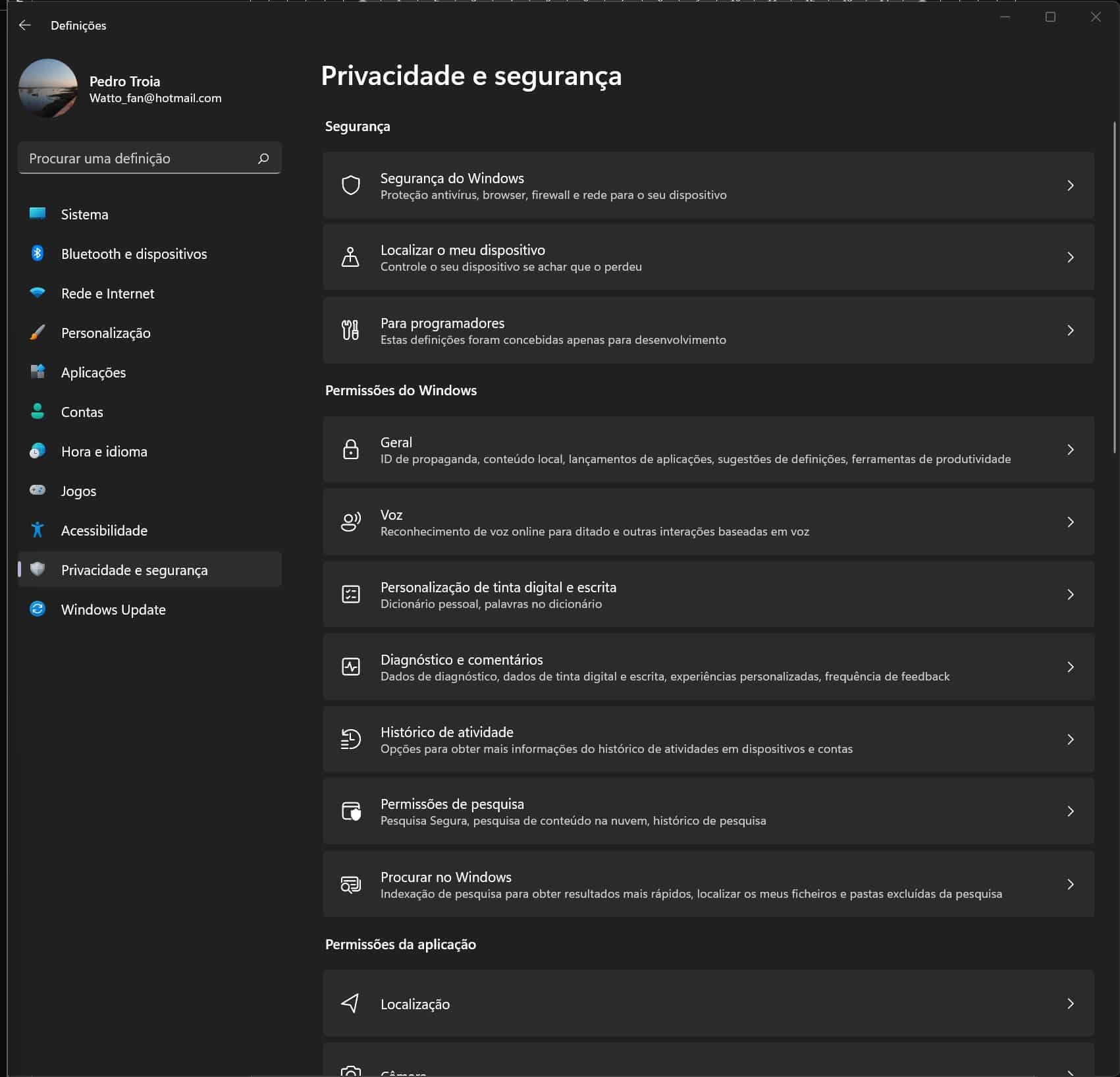 Aceda às ‘Definições’ do Windows 11 (Tecla Windows + I). Na coluna da esquerda, clique em ‘Privacidade e segurança’ e depois em ‘Procurar no Windows’.