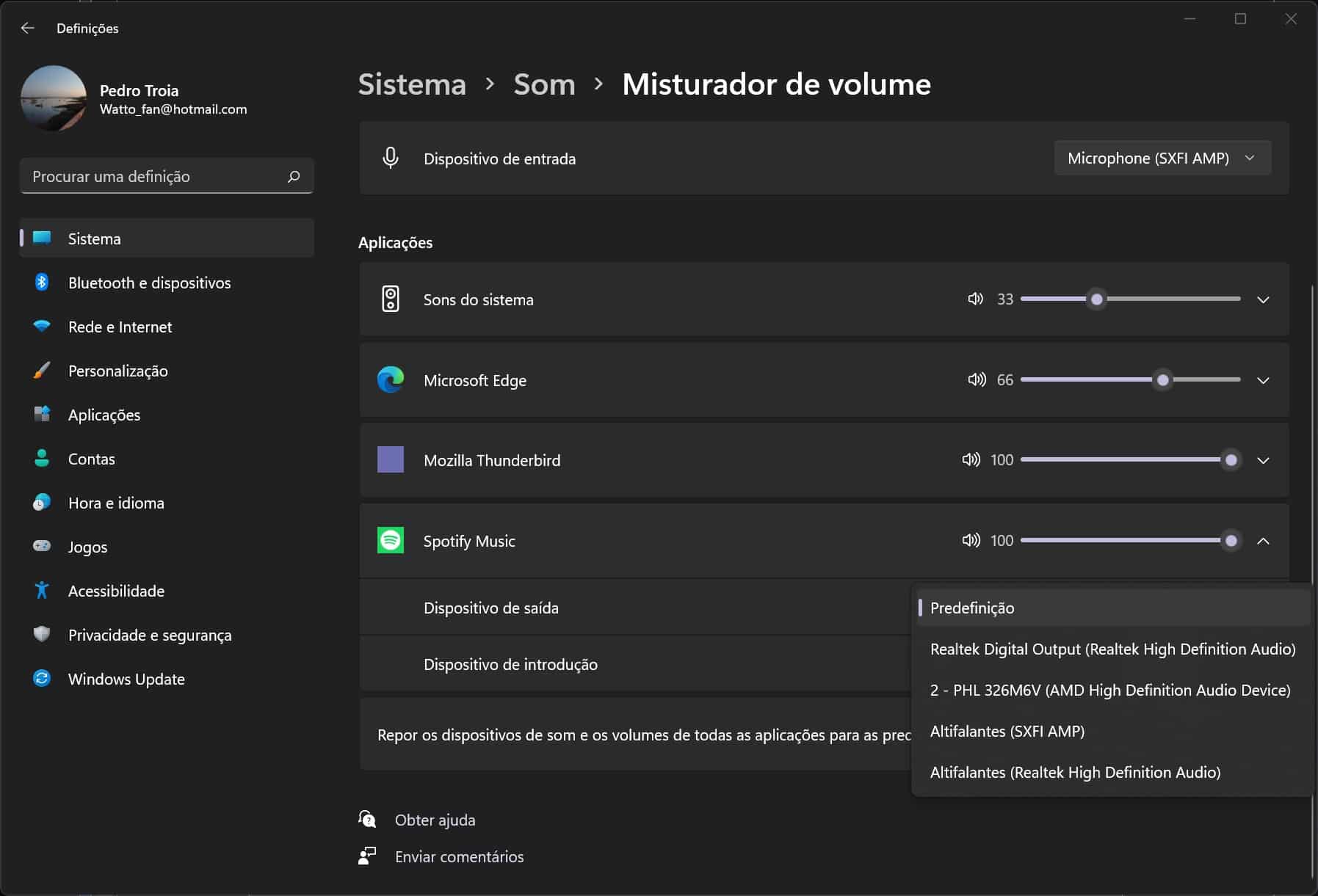 No Windows 11, o utilizador pode escolher um dispositivo de reprodução preferencial para todo o sistema, ou por aplicação.