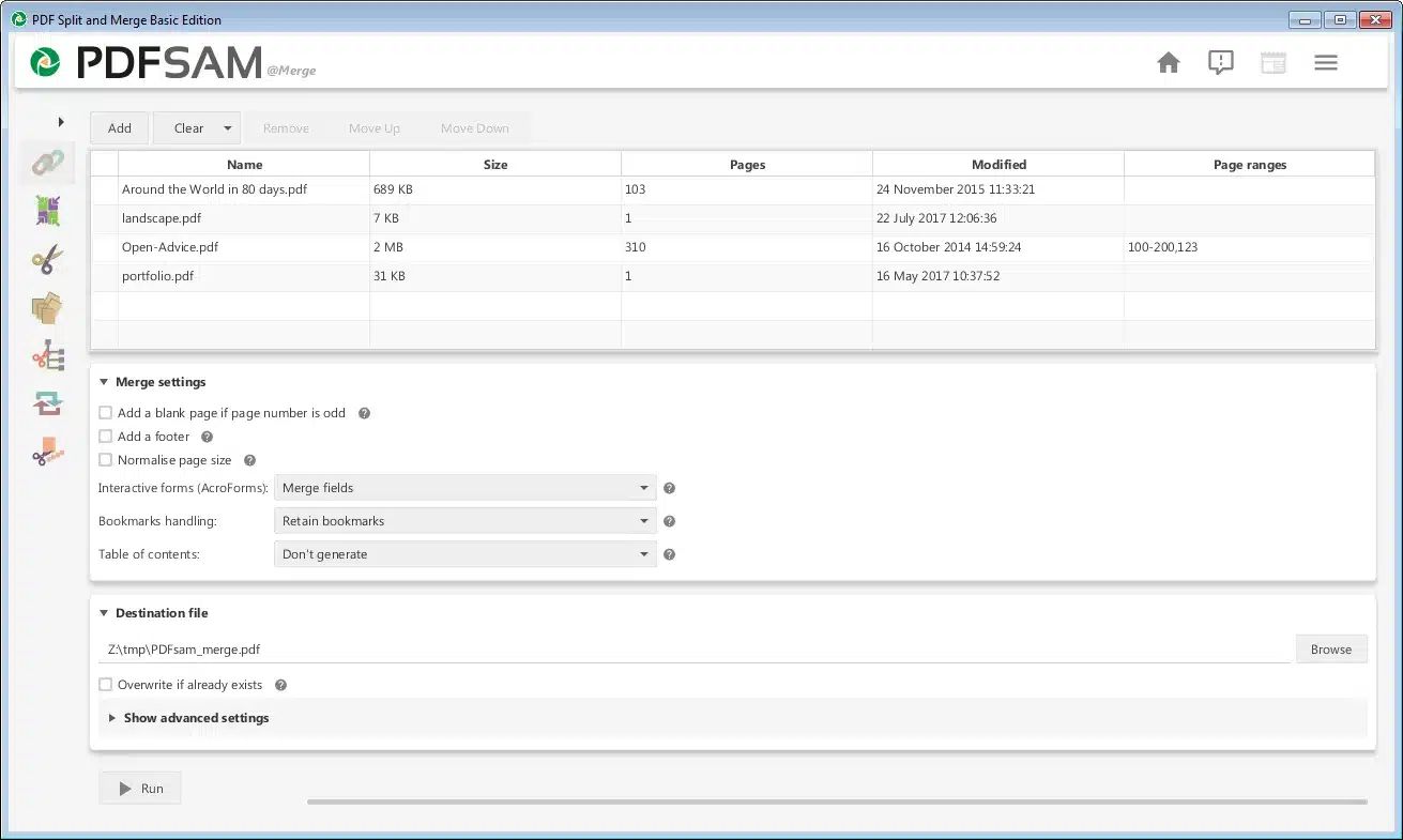 A ferramenta de fusão de documentos PDF, permite criar índices automaticamente, normalizar a largura das páginas, adicionar rodapés com o nome do ficheiro em cada página, adicionar páginas em branco em documentos com um número ímpar de páginas, para facilitar a impressão duplex.