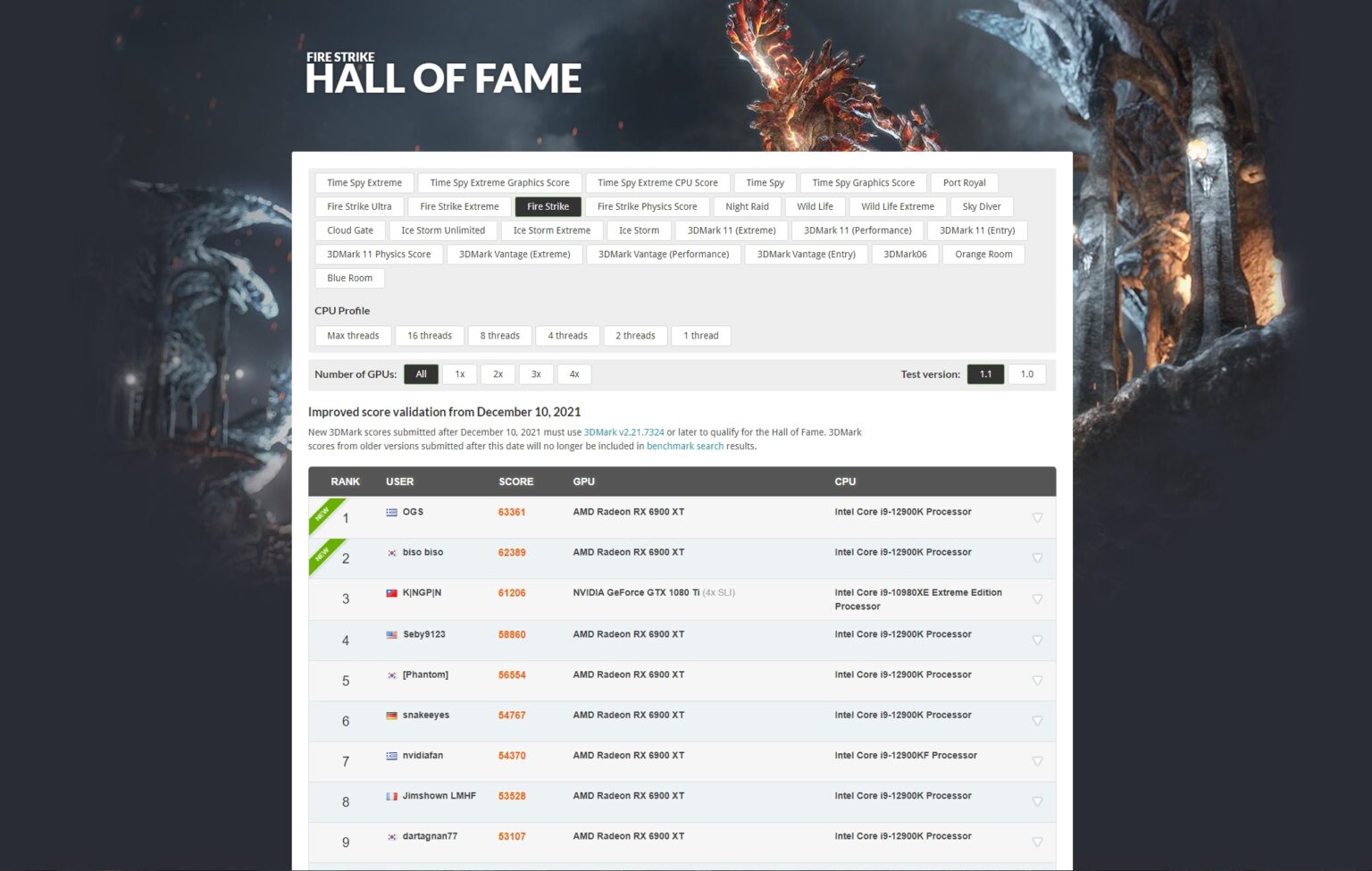 Em apenas dois dias, a chamada Hall of Fame da popular conjunto de ferramentas de benchmark 3DMark foi invadida por novos recordes, em especial nas diversas variantes dos testes Fire Strike e Time Spy. Este feito foi atingido, inicialmente, pelo Sul Coreano “Biso Biso”, que utilizando um sistema composto pelo novo processador Intel Core i9-12900K, motherboard EVGA Z690 Dark KINGPIN e uma AMD Radeon RX 6900 XT, conseguiu bater o recorde no teste Time Spy e Time Spy Graphics Score, bem como nos testes Fire Strike, Fire Strike Extreme e Fire Strike Ultra.