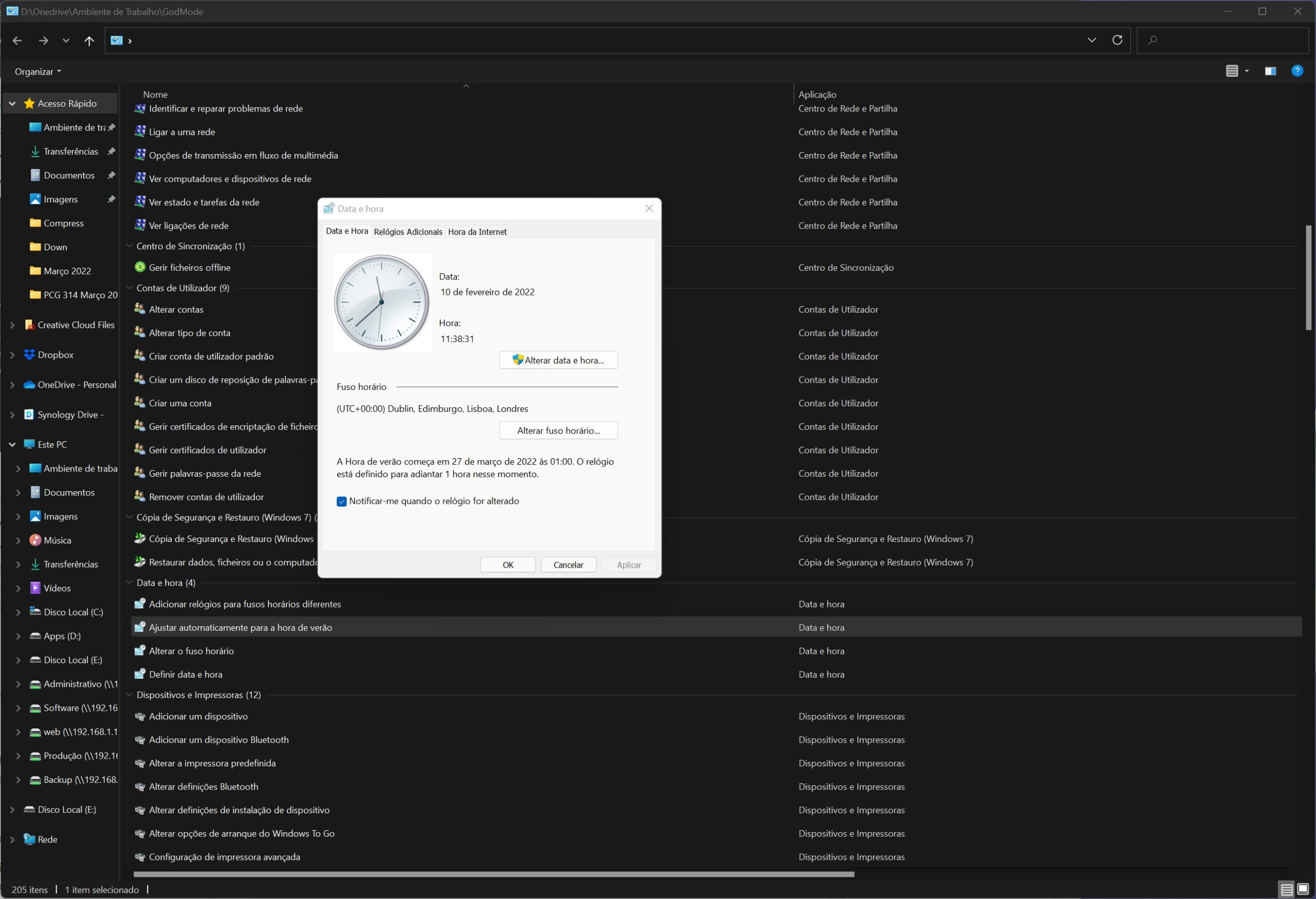 Quando esta funcionalidade foi descoberta, era considerada uma coisa que só era usada pelos “power users” do Windows, mas é apenas uma forma de aceder rapidamente a todas as definições que o utilizador pode alterar no Windows. Por exemplo, em ‘Data e Hora’, pode ligar e desligar a mudança para hora de verão ou para a hora de inverno. Também pode adicionar mais relógios para outros fusos horários. Claro que o God Mode também dá acesso a outras definições mais avançadas, como as variáveis de sistema ou ao sistema de criação e formatação de partições.