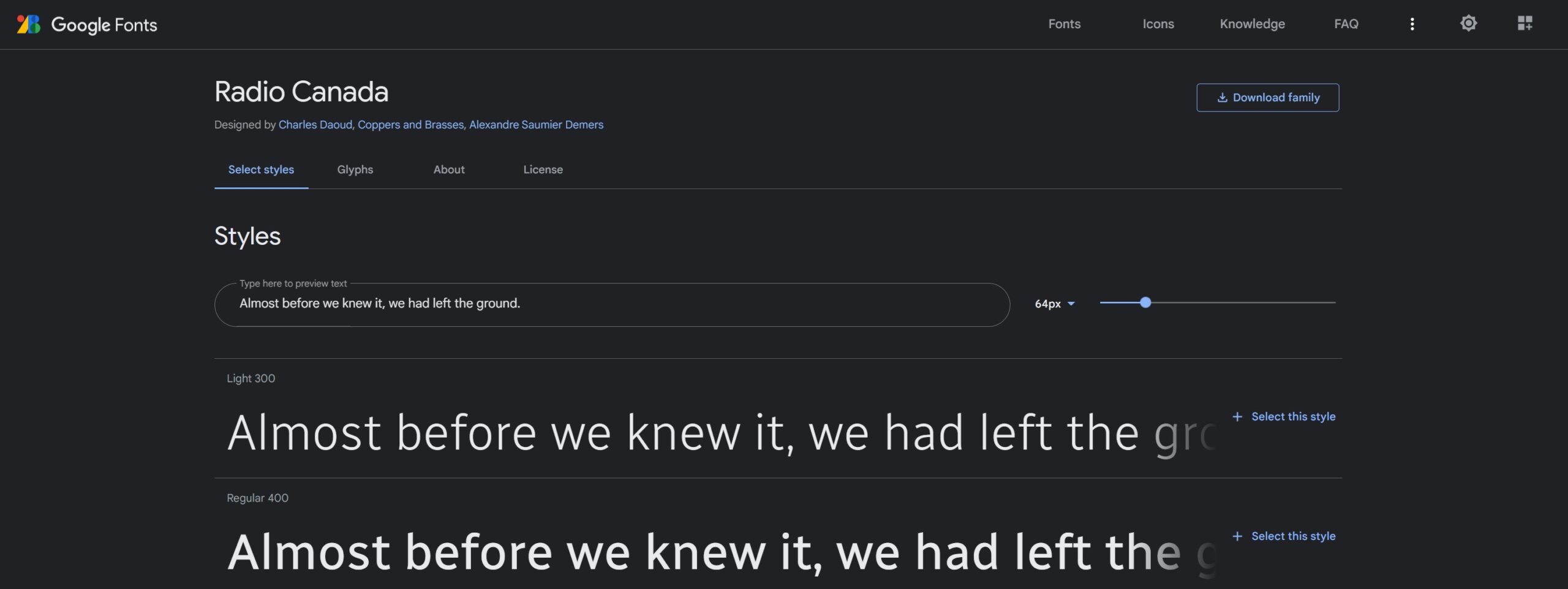 Neste exemplo, vamos descarregar o tipo de letra ‘Radio Canada’ do Google Fonts. Assim que encontrar o tipo de letra pretendido, clique em ‘Download font family’.