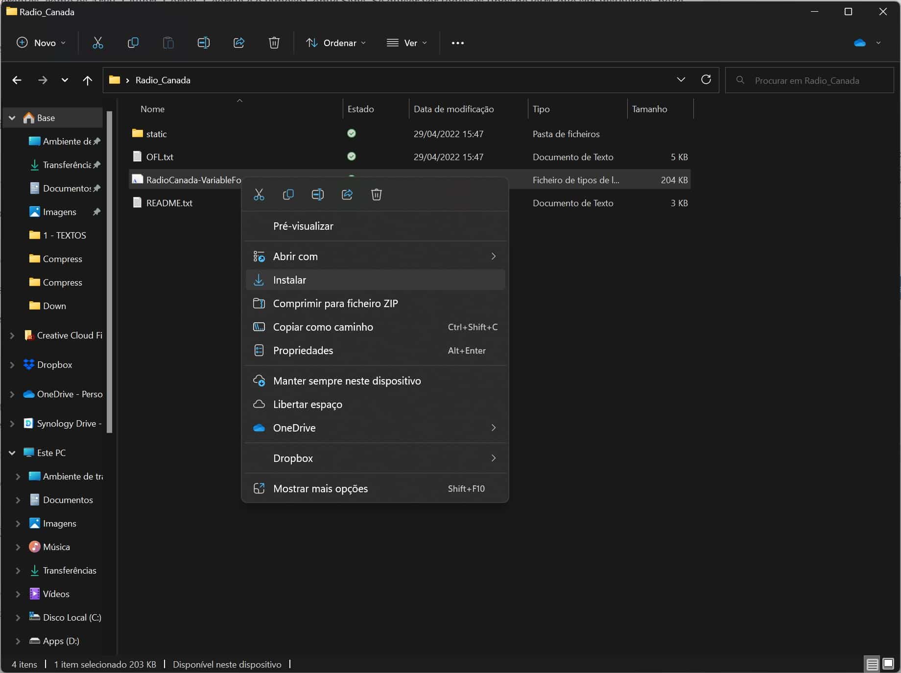 Abra a pasta onde foram colocados os ficheiros do tipo de letra, clique em cima do ficheiro com a extensão .TTF (ou .OTF, se for o caso) e escolha a opção ‘Instalar’.