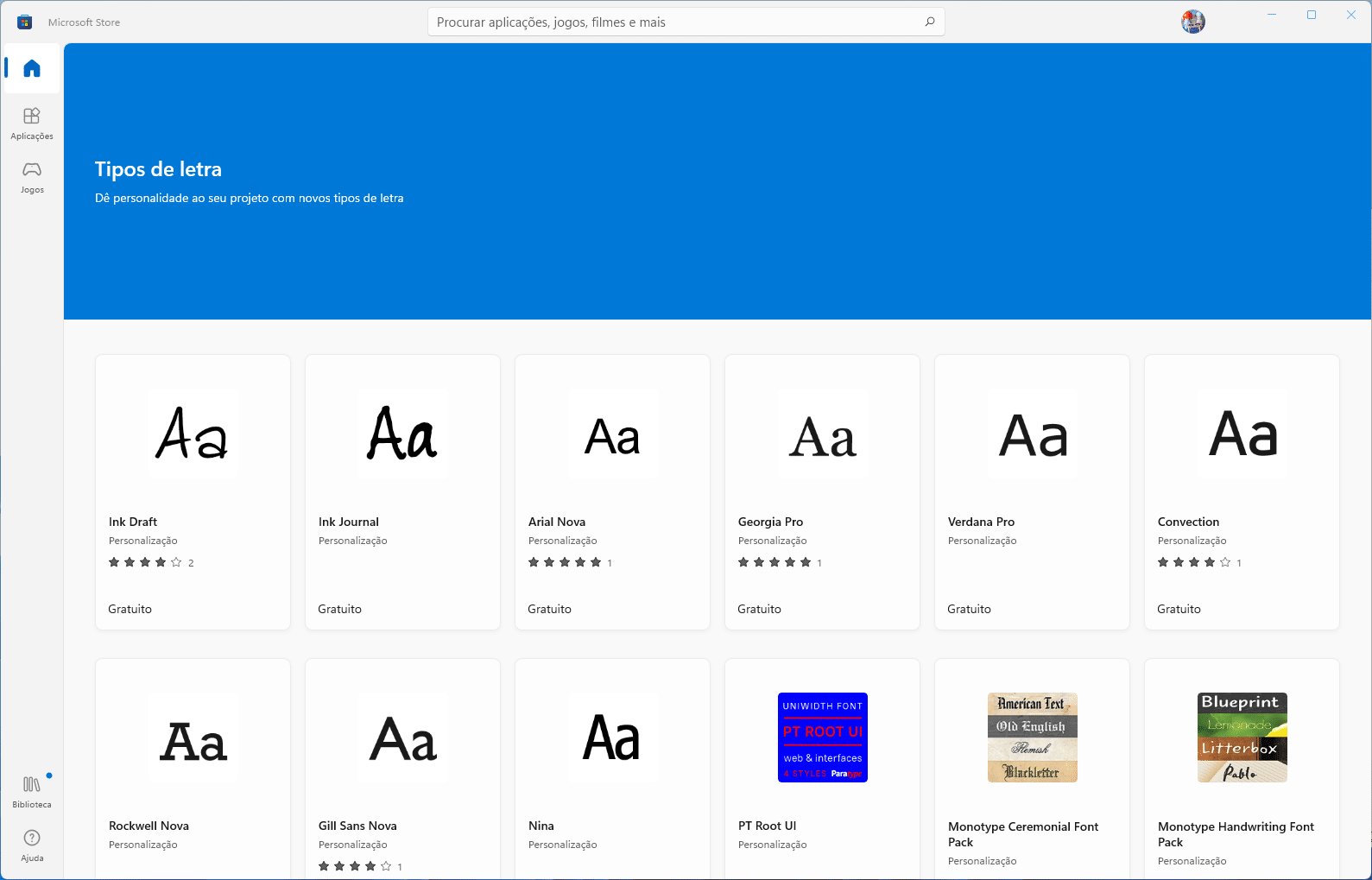 Se quiser descarregar mais tipos de letra para instalar, pode clicar em ‘Obter mais tipos de letra na Microsoft Store’. Será transportado para a página dos tipos de letra da loja Microsoft, depois é só clicar em ‘Instalar’ junto ao tipo de letra pretendido.