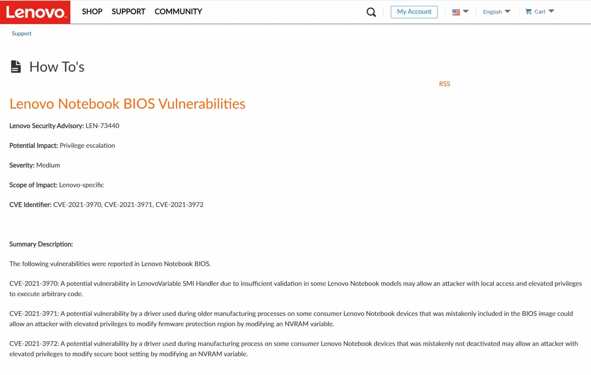 A Lenovo confirmou a presença destas vulnerabilidades a 17 de Novenbro, tendo criado uma lista com os dispositivos afectados, com modelos como os IdeaPad 3, Legion 5 Pro e Yoga Slim 7 Pro, onde são indicados os procedimentos para a actualização do firmware de cada modelo afectado. Para mais informações técnicas sobre estas vulnerabilidades, poderá consultar o WeLiveSecurity da ESET relativamente a este caso.