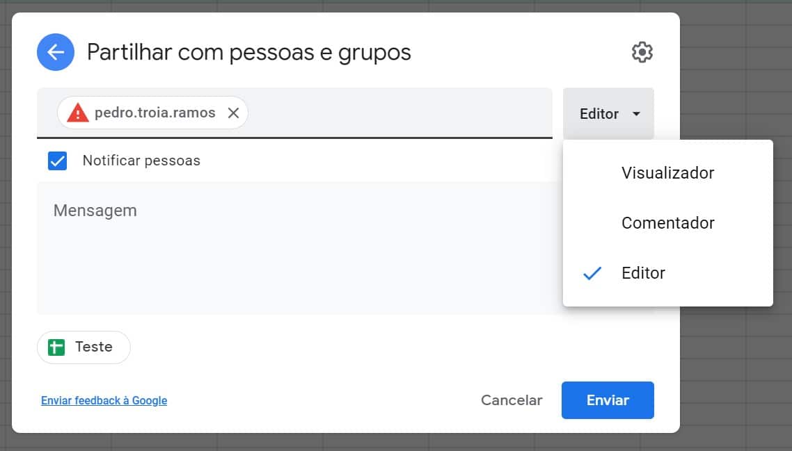 Assim que inserir o primeiro endereço de email no campo superior, aparece um novo menu do lado direito que permite definir o papel da pessoa (ou pessoas) com quem está a partilhar a folha de cálculo.