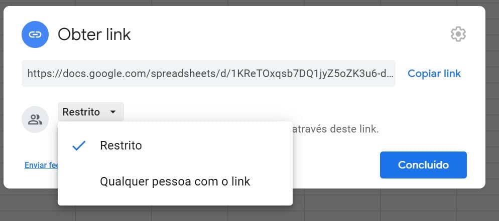 Por defeito, apenas as pessoas com quem partilhou a folha de cálculo terão acesso ao link. Se quiser partilhar a folha de cálculo com qualquer pessoa, clique junto a ‘Restito’ e escolha a opção ‘Qualquer pessoa com o link’.