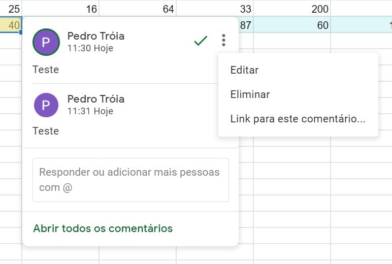 Para responder ao comentário, clique na célula. O cartão com o comentário expande-se para revelar um campo onde pode escrever a resposta. Quando acabar, clique em ‘Responder’. O cartão mostrará o comentário original e as respostas.