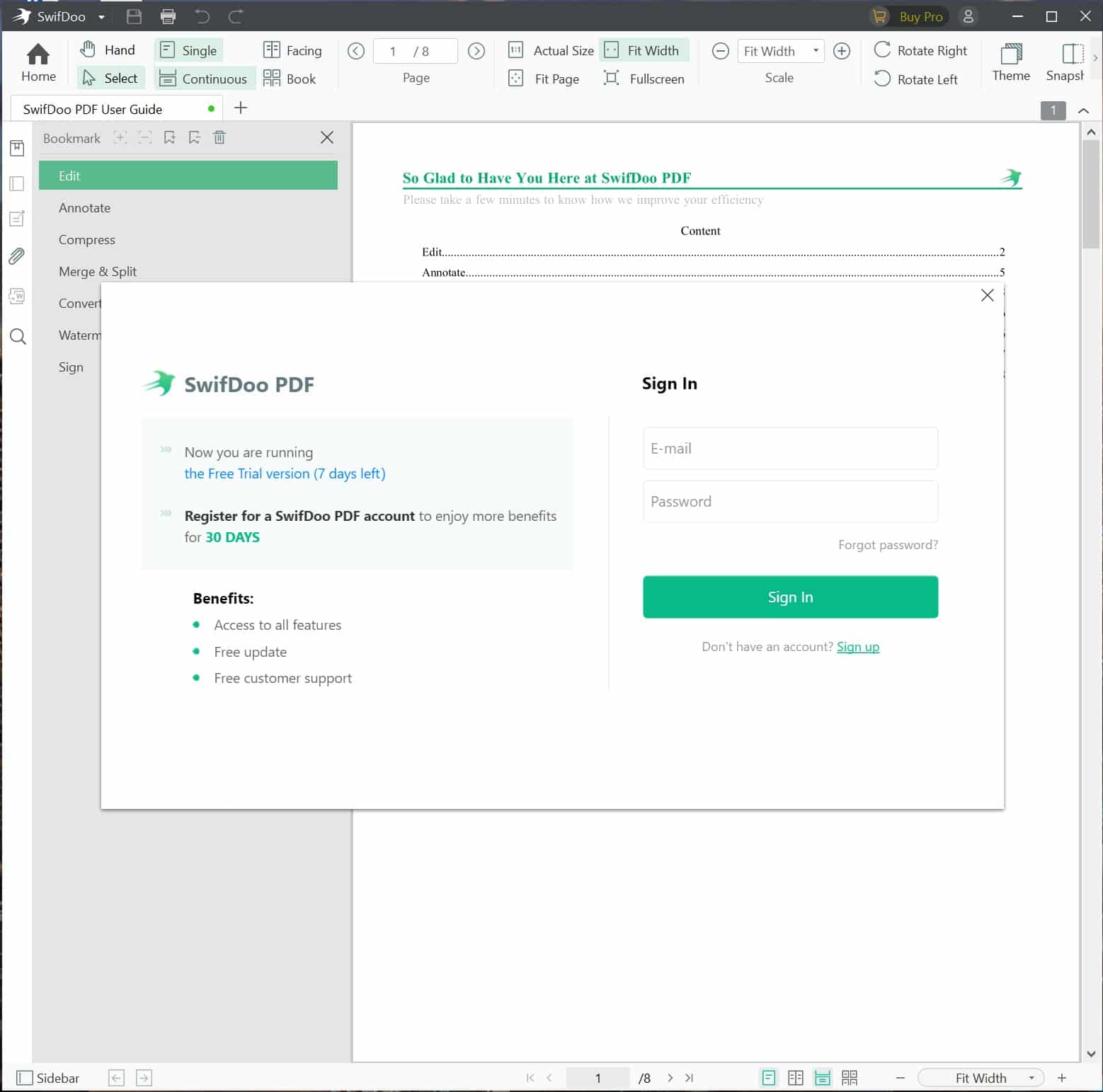 Em termos de instalação do SwifDoo PDF, esta não poderia ser mais simples, bastando descarregar o software a partir da página oficial em swifdoo.com. Após a instalação, irá deparar-se com uma janela pop-up que lhe pedirá para fazer login na sua conta de utilizador, por forma a permitir utilizar esta ferramenta durante 30 dias, caso contrário só terá acesso a 7 dias para poder experimentar, de forma totalmente gratuita, todas as suas funcionalidades.