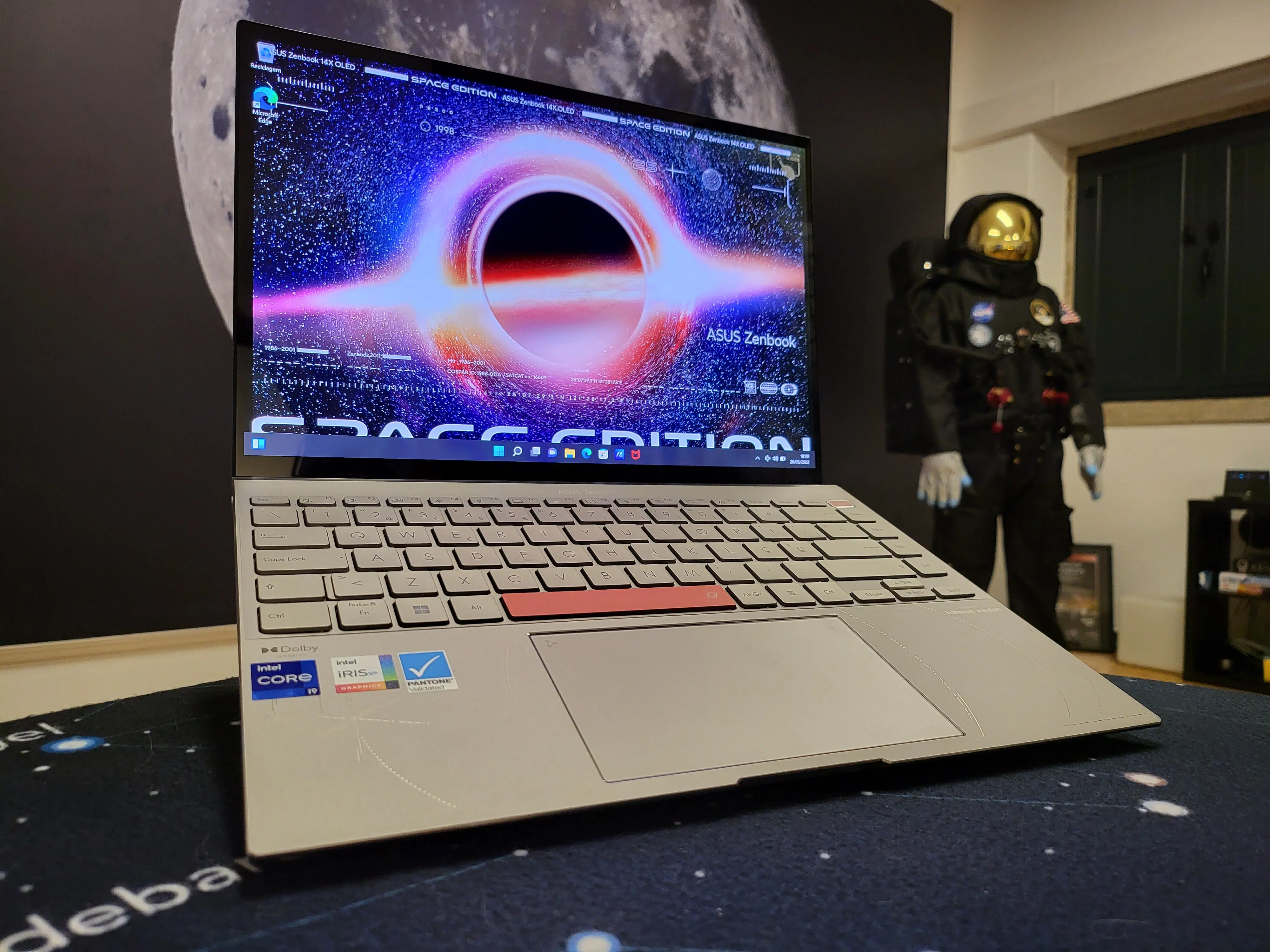 Deixando o chassis de parte, este Zenbook 14X OLED vem equipado, como o nome indica, com um impressionante ecrã OLED de 2.8K com 14 polegadas e formato 16:10, que consegue reproduzir 100% do espectro de cores DCI-P3, tendo ainda validação Pantone para garantir a precisão de cor. É compatível com a norma DisplayHDR Tru Black 500, tem até 550 nits de brilho máximo e 90 Hz de taxa de actualização.