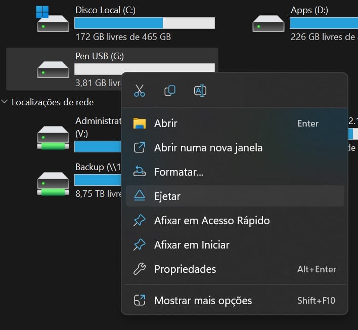 O Windows tem uma funcionalidade chamada ‘Remoção rápida’ que serve para minimizar os problemas descritos acima, mas consome alguns recursos do computador, o que tem impacto no desempenho da máquina. Também pode usar o menu contexto da drive na janela ‘Este PC’ (clicar com o botão direito em cima do ícone da drive) e escolher a opção ‘Ejectar’.