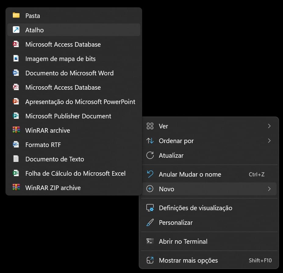 Clique com o botão direito do rato numa qualquer zona vazia do ‘Ambiente de trabalho’. No menu de contexto, escolha ‘Novo’ e depois ‘Atalho.