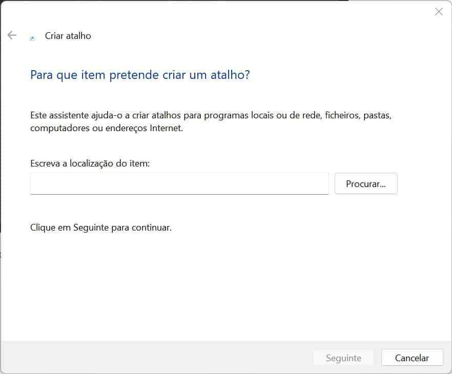 No campo ‘Escreva a localização do item:’ insira o seguinte (pode copiar o texto abaixo e colá-lo na janela do assistente de criação do atalho: