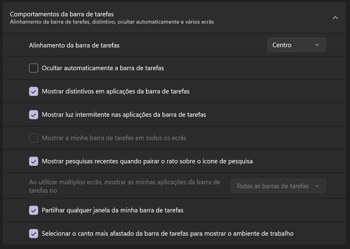 Depois de clicar na opção ‘Comportamentos da Barra de Tarefas’, esta expande-se e aparecem mais umas quantas opções que permitem alterar o funcionamento deste componente da interface do sistema operativo. Procure a opção ‘Mostrar a minha Barra de Tarefas em todos os ecrãs’ e desligue-a.
