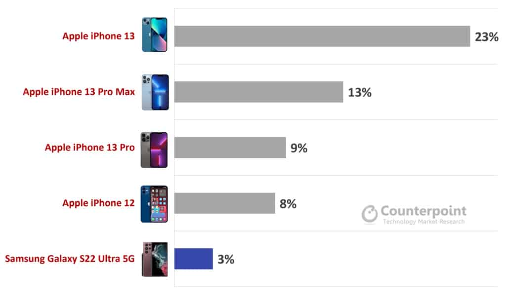 Segundo a consultora Counterpoint Research, a Apple domina o segmento ‘Premium’ de smartphones, ou seja, qualquer equipamento móvel acima dos 400 dólares, tendo actualmente cerca de 62% de quota de mercado, segundo os resultados do primeiro trimestre de 2022. Comparativamente ao período homólogo, a Apple cresceu 5%, dos anteriores 57% conquistados em Q1 de 2021.