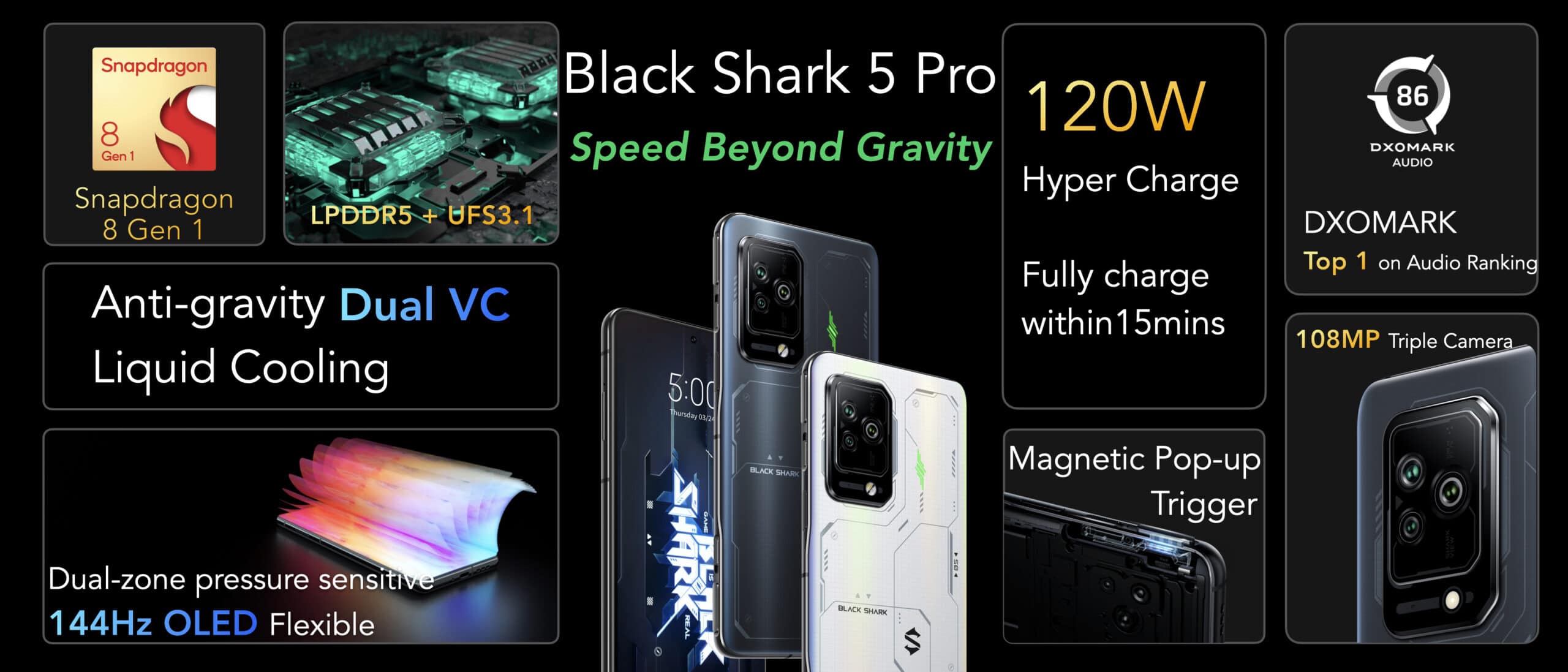 Internamente, ambos utilizam um sistema de arrefecimento de elevado desempenho, essencial para garantir um alto desempenho continuado para o processador Qualcomm Snapdragon 870 aplicado no Black Shark 5, ou o Snapdragon 8 Gen1 aplicado no Black Shark 5 Pro. O primeiro vem acompanhado de 8 ou 12 GB de memória LPDDR5 a 5500 MHz, sendo o segundo acompanhado por 8, 12 ou 16 GB de memória RAM LPDDR5 a 6400 MHz.
