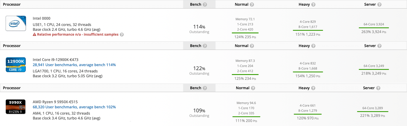Esta informação foi recentemente confirmada em mais um benchmark publicado com o novo Intel Core i9-13900K, mas ao contrário do anterior resultado de benchmark divulgado, desta vez o novo processador de arquitectura Raptor Lake já revelou uma melhoria significativa em termos de desempenho, face aos actuais processadores topo de gama da Intel e AMD, no teste de “Server” do UserBenchmark, que utiliza até 64 threads ao mesmo tempo.