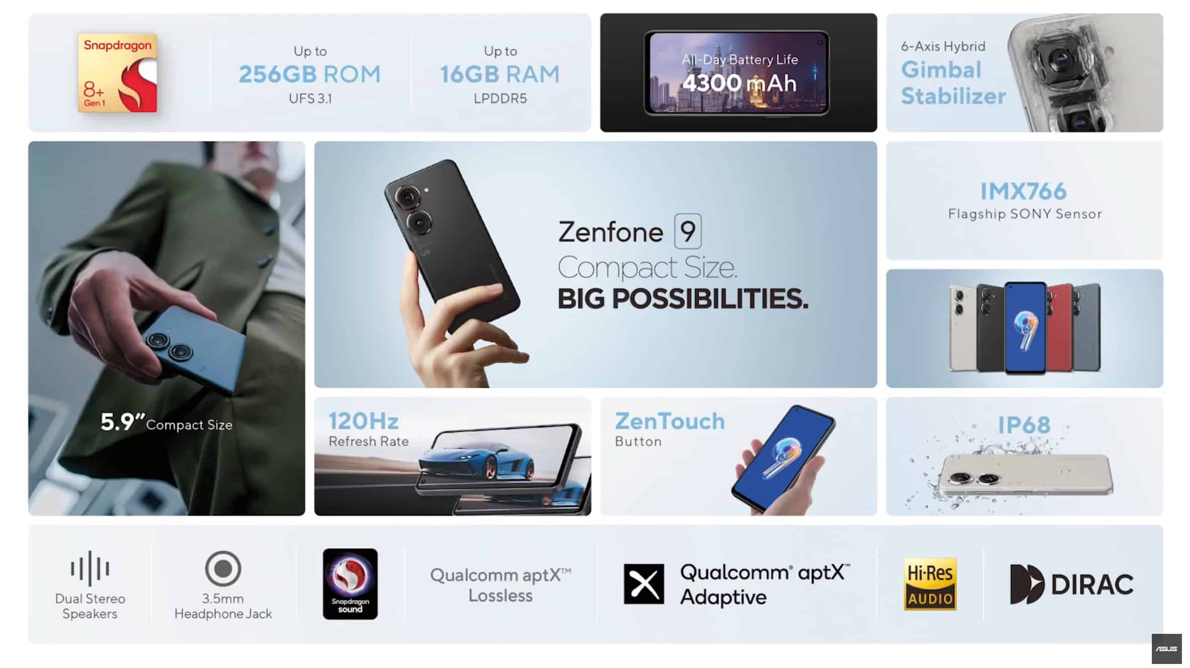 Apesar das dimensões compactas, o Zenfone 9 apresenta-se como um verdadeiro gigante, estando equipado com o novíssimo processador Snapdragon 8+ Gen1 de oito núcleos e de elevado desempenho, até 16 GB de memória RAM e até 256 GB de armazenamento. Utiliza uma câmara de vapor para garantir um arrefecimento mais eficaz de todo este sistema. A bateria de 4300 mAh garante longas horas de utilização, sendo carregada rapidamente a partir do alimentador fornecido de 30W.