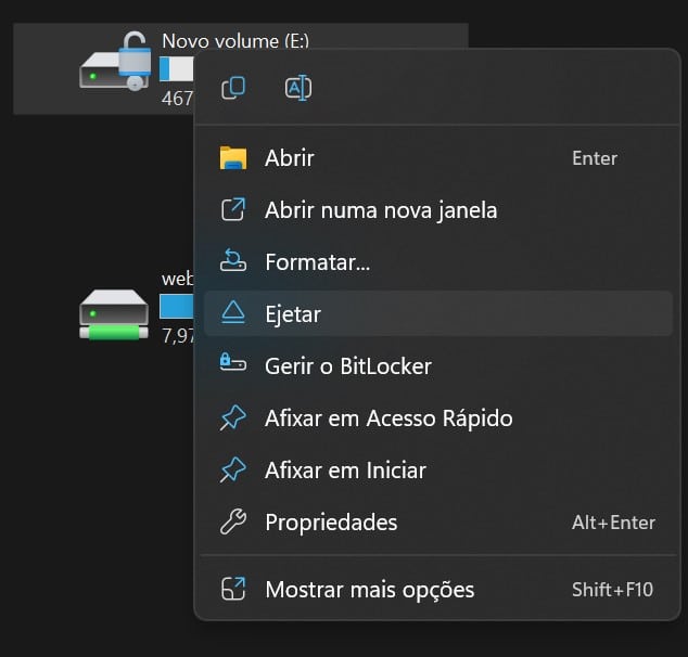 Clique com o botão direito do rato em cima do ícone da drive virtual e escolha a opção ‘Ejectar’ no menu.