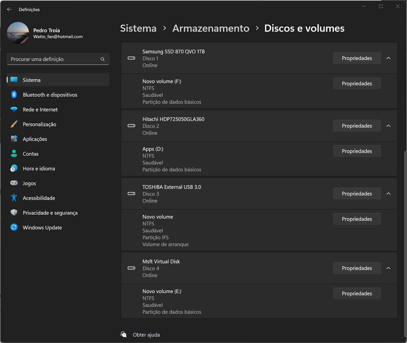 De seguida, faça scroll no conteúdo da janela até chegar a ‘Definições de armazenamento avançado’, clique em cima dessa opção e depois clique em ‘Discos e volumes’.