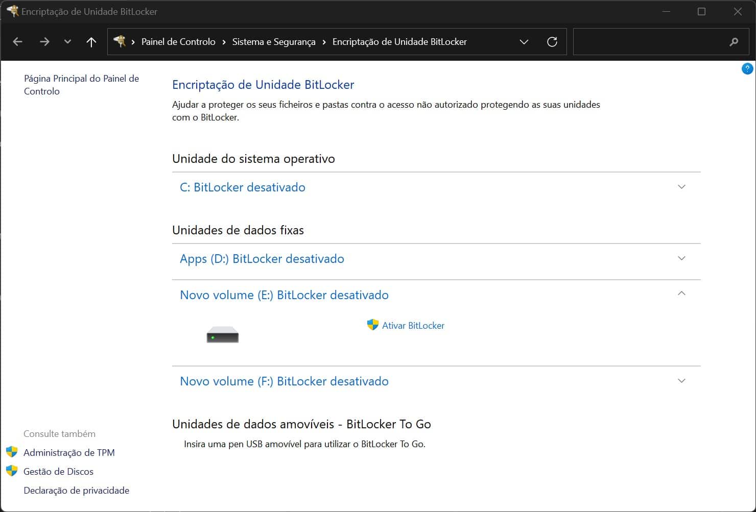 Clique em ‘Activar BitLocker’.
