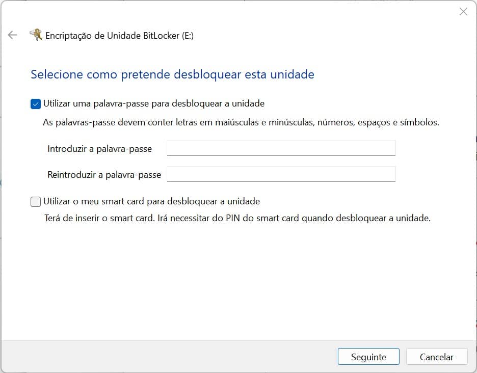 Ligue a opção ‘Utilizar uma palavra-passe para desbloquear a unidade’. Insira a confirme a password nos campos abaixo. Clique em ‘Seguinte’.