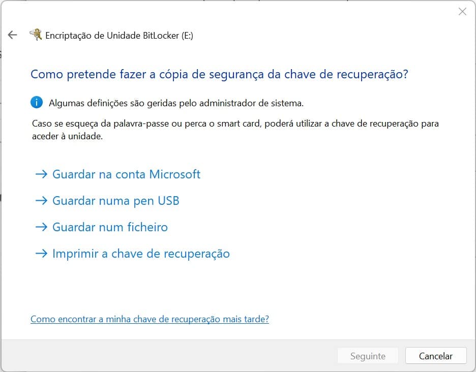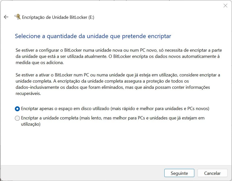 No ecrã seguinte escolha a opção ‘Encripta apenas o espaço em disco utilizado’. Clique em ‘Seguinte’.