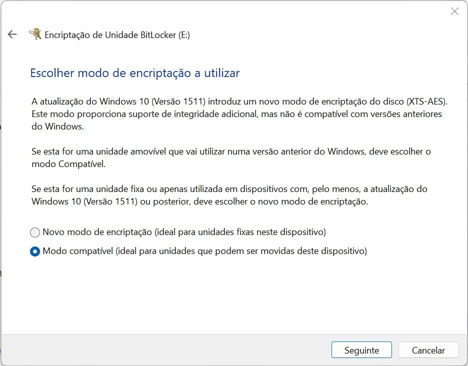 A seguir, escolha a opção ‘Modo compatível’ e clique em ‘Seguinte’.