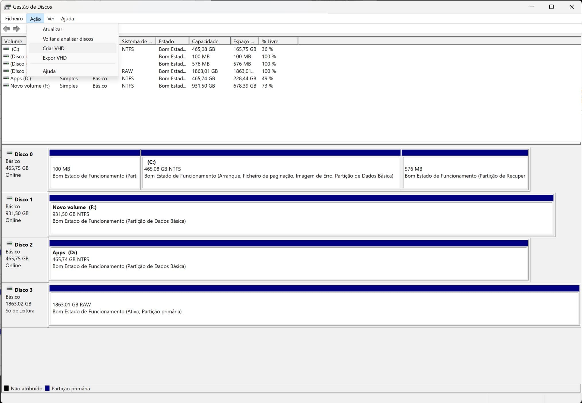 Clique no menu ‘Acção’ e depois em ‘Criar VHD’.