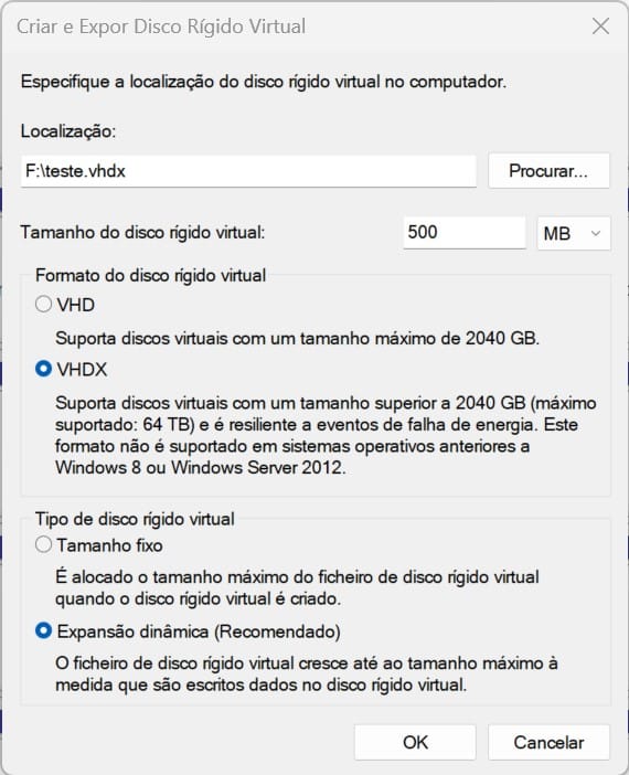 Em ‘Formato do disco rígido virtual’ escolha a opção ‘VHDX’. Na secção ‘Tipo de disco virtual’, escolha a opção ‘Expansão dinâmica’ para que o disco cresça à medida que lá vai colocando ficheiros.