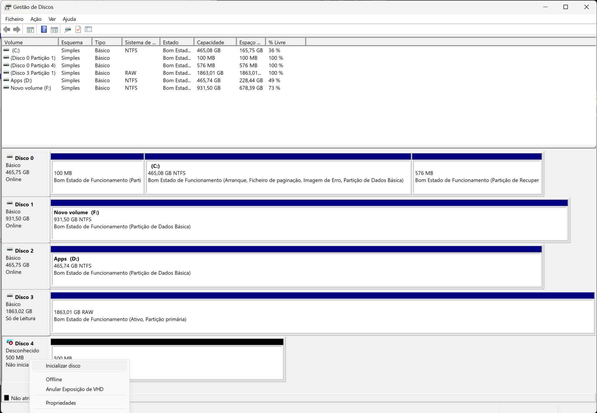 Na janela principal da aplicação ‘Gestão de discos’ clique com o botão direito em cima da linha onde apareceu o novo disco virtual acabado de criar e escolha a opção ‘Inicializar disco’.