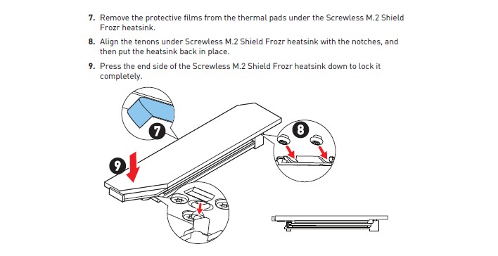 Aparentemente, trata-se de um conjunto que inclui um dissipador de calor. Na prática, o SSD M.2 é colocado na ranhura e alinhado através de uns pinos, de seguida é colocado o dissipador de calor por cima do SSD e é essa peça que é depois presa à motherboard através da utilização de uma outra peça que tem uma mola que permite prender e desprender a unidade.