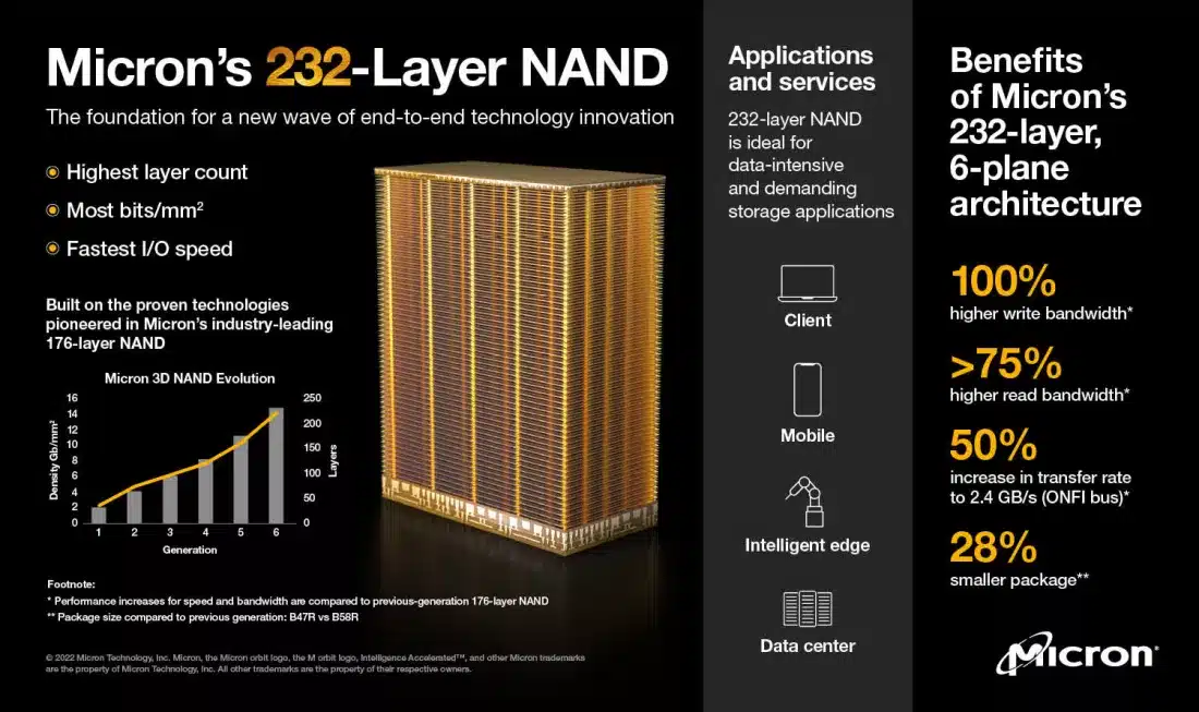 As novas memórias NAND de 232 camadas também oferecem melhorias de desempenho, porque aumentam o número de planos por die de quatro para seis, o que melhora o desempenho em acessos paralelos e a norma ONFi 5.0 aumenta as taxas de transferência de dados em 50 por cento para 2400 MT/s. Segundo a Micron, as novas memórias oferecem um aumento de 75 por cento da largura de banda, quando comparadas com as da geração anterior.