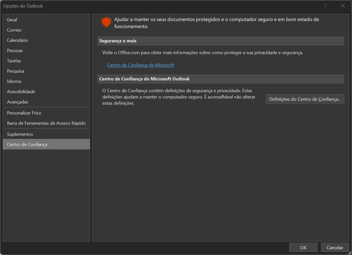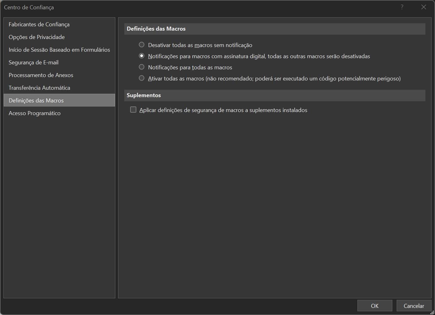 Aqui tem as opções que lhe permitem bloquer ou desbloquear a execução de macros. Esta definição é igual para todas as aplicações do Office.