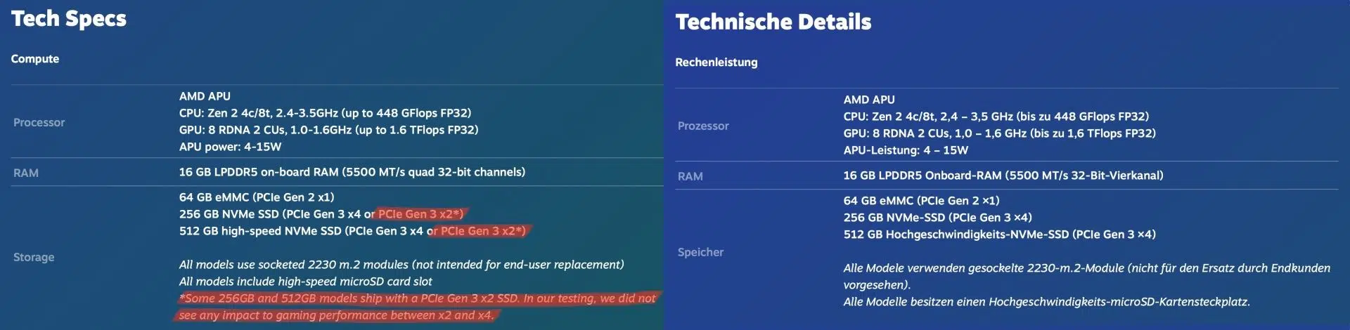 Aparentemente, a Valve optou por colocar módulos SSD PCIe 3.0 x2 nas versões de 256 e 512 GB, em vez dos anteriormente anunciados PCIe 3.0 x4, o que limita a largura de banda dos mesmos para metade, de 4 GB/s para apenas 2 GB/s.