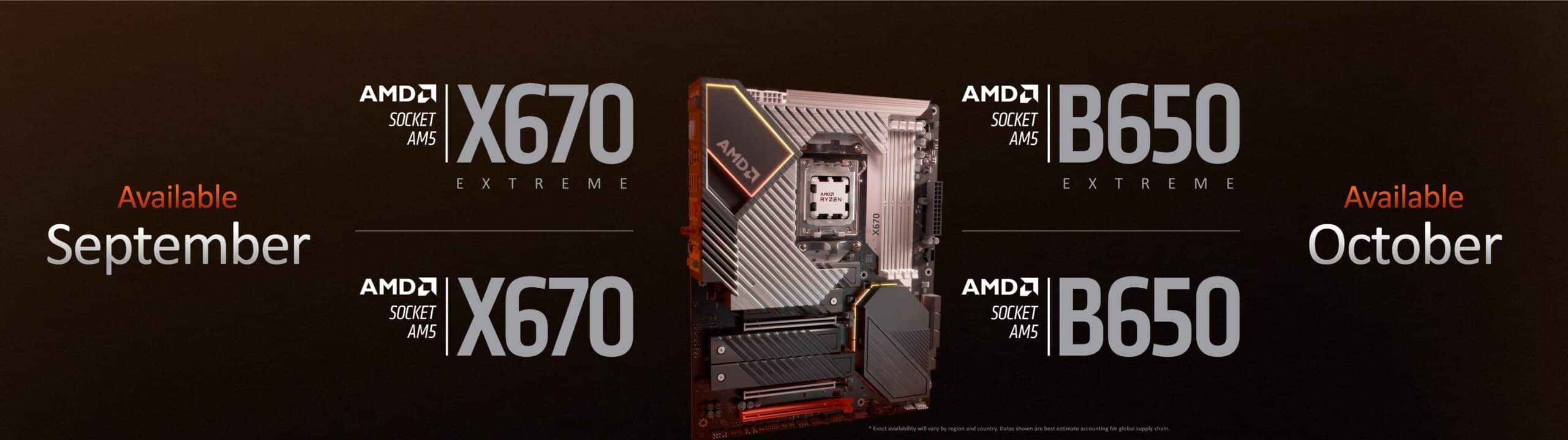 Numa fase inicial, serão lançados quatro novos chipsets para esta nova plataforma, os AMD X670 e B650, que permitirão usar a interface PCIe 5.0 ou na placa gráfica, ou no armazenamento M.2 NVMe, e os AMD X670E e B650E, com a designação final “E” de “Extreme”, que permitirão usar a interface PCIe 5.0 em ambas as situações.