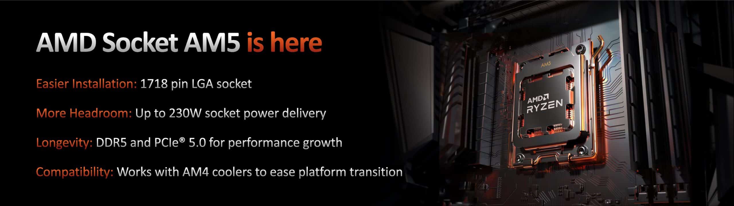 Chegou a vez de abrir caminho para a nova plataforma AM5, que tirará partido do novo encaixe em formato LGA (Land Grid Array) com 1718 contactos, essencial para aumentar o número de pistas essenciais para as novas interface PCIe 5.0 e memórias DDR5, bem como garantir uma alimentação estável até uma potência máxima de 230W, garantindo ao mesmo tempo que todas as soluções de arrefecimento para a anterior plataforma AM4 são totalmente compatíveis.