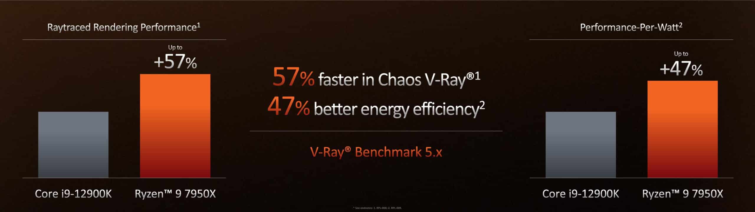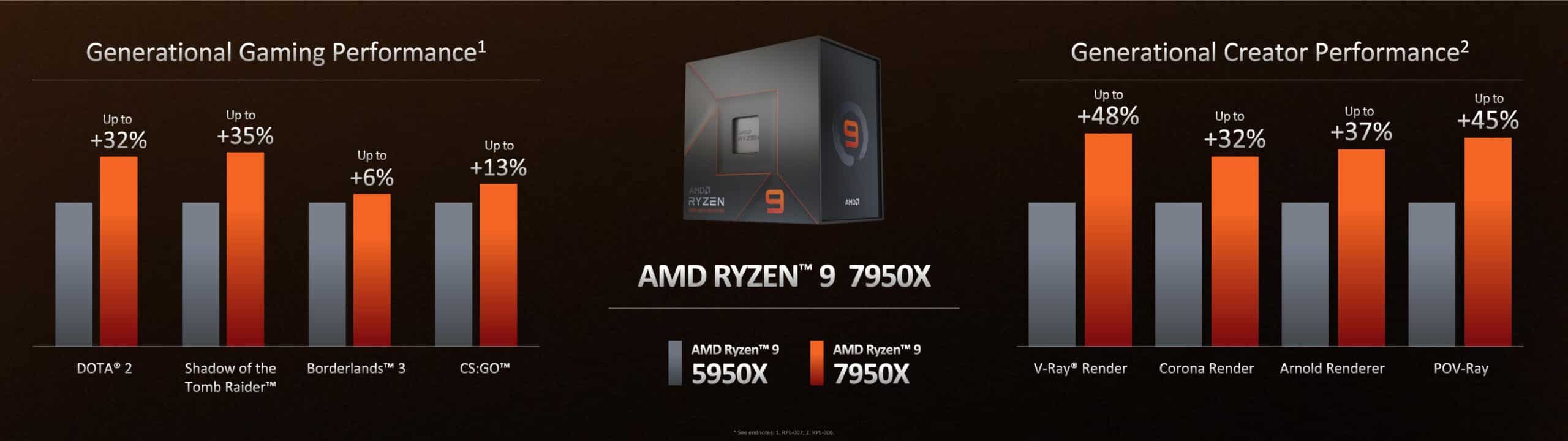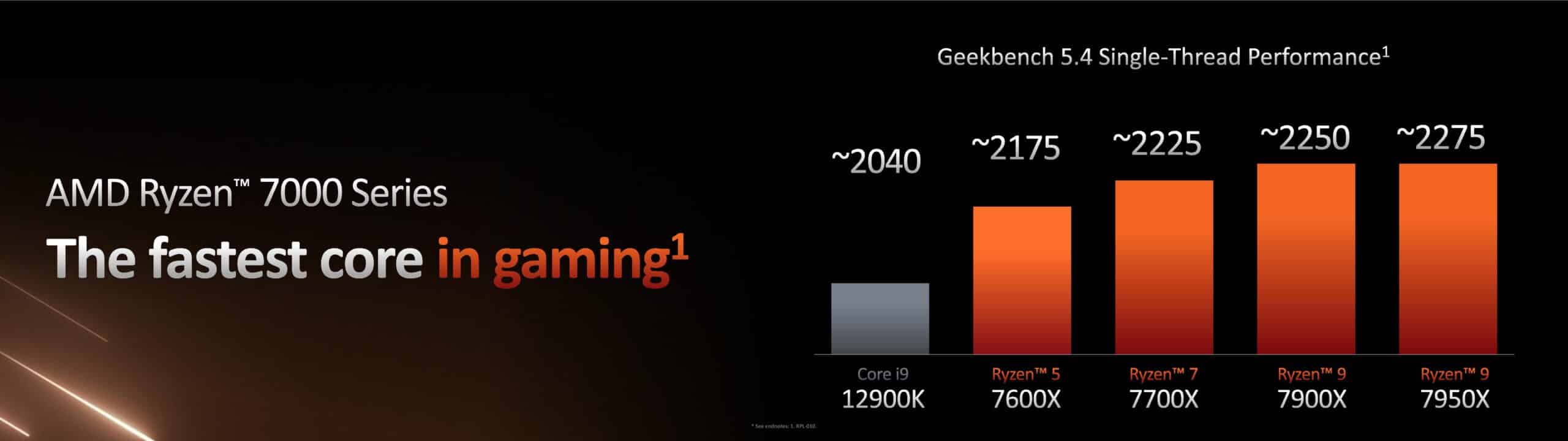 Comparativamente aos seus principais rivais, a AMD anuncia que o novo Ryzen 9 7950X de 16 núcleos consegue ser até 11% mais rápido que o Intel Core i9-12900K, sendo inclusive o processador de entrada de gama Ryzen 5 7600X 5% mais rápido (em jogos) que o modelo topo de gama da Intel. Naturalmente que as contas poderão ser diferentes com os futuros Intel Core de 13ª geração Raptor Lake, que deverão duplicar o número de núcleos E, entre outras melhorias.