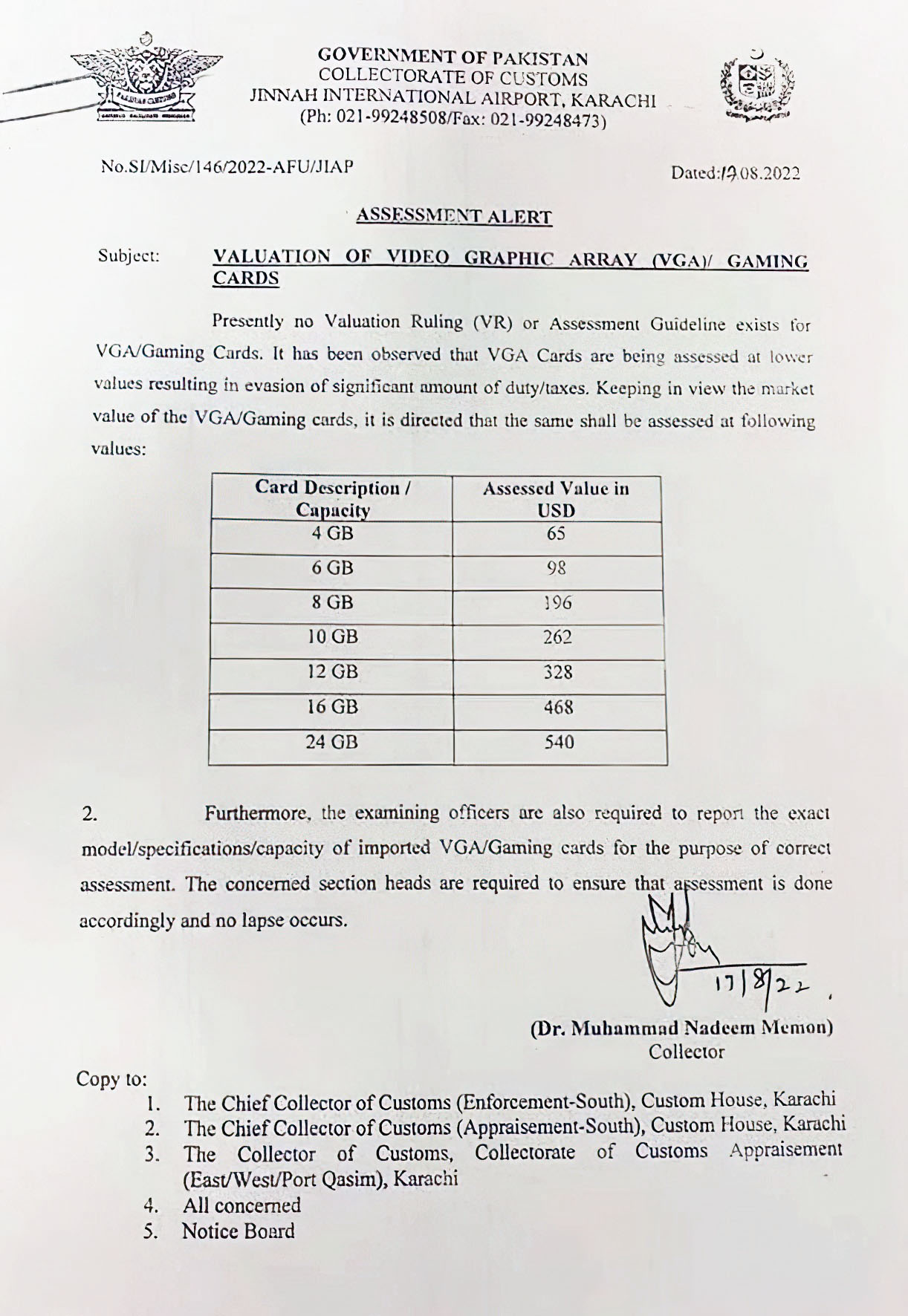 Para contornar esta situação, o Governo do Paquistão decidiu aplicar uma nova medida, que além do imposto de 36% em vigor, aplica uma taxa adicional que corresponde à quantidade de memória que cada placa gráfica utiliza. Através de uma tabela de valor fixo para cada quantidade de memória utilizada, de 4 GB a 24 GB, este valor pode implicar um aumento do custo da placa gráfica entre 13.975 e 116.100 rupias paquistanesas, o que corresponde a um aumento que varia entre os 65 euros e os 540 euros.