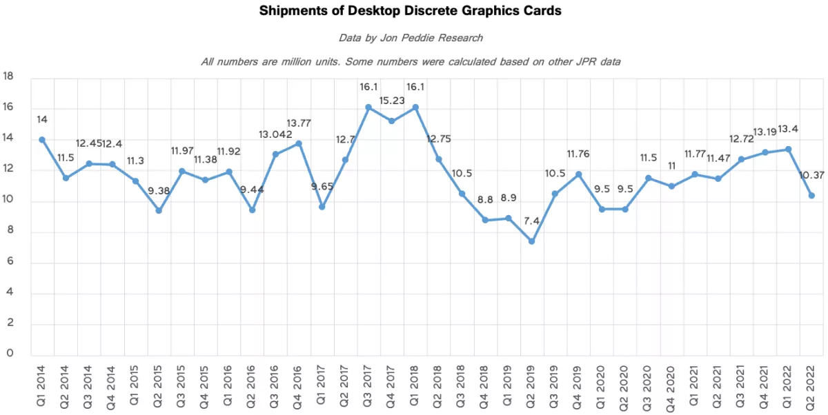Os valores são ainda piores no caso das placas gráficas para PC de secretária. As vendas deste tipo de hardware caíram 22,6% no segundo trimestre de 2022, para cerca de 10,7 milhões de unidades. O valor mais baixo desde o segundo trimestre de 2020.