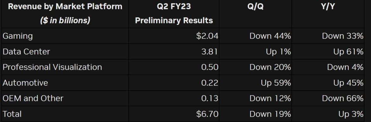 Prestes a realizar a apresentação de resultados do segundo trimestre de 2022 (Q2 do ano fiscal 2023), a Nvidia revelou em antemão os resultados financeiros preliminares, como forma de avisar os investidores que os resultados oficiais vão ser piores que o esperado. Inicialmente a Nvidia previa uma receita de 8.1 mil milhões de dólares, mas segundo os dados apresentados, esse valor reduziu para os 6.7 mil milhões. Isto corresponde a um desvio de 21%, que poderá resultados desastrosos em valorização na bolsa.